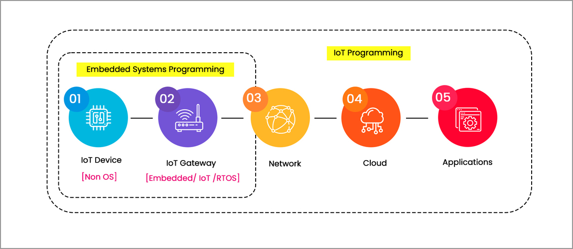 IoT is a big paradigm that tries to integrate multiple thing together. Embedded Systems are part of the overall IoT by taking two key components in terms of IoT devices and IoT gateway. The IoT devices are smaller and specific in nature which will not have OS running them. However IoT gateway are larger and generic in nature which will have OS running them. These OS can come in multiple flavors namely Embedded OS, IoT OS or RTOS. With this Embedded programming becomes a part of IoT programming.